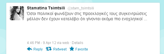 Η Σταματίνα Τσιμτσιλή εκφράζει συχνά μέσω twitter την άποψή της για διάφορα κοινωνικά θέματα.